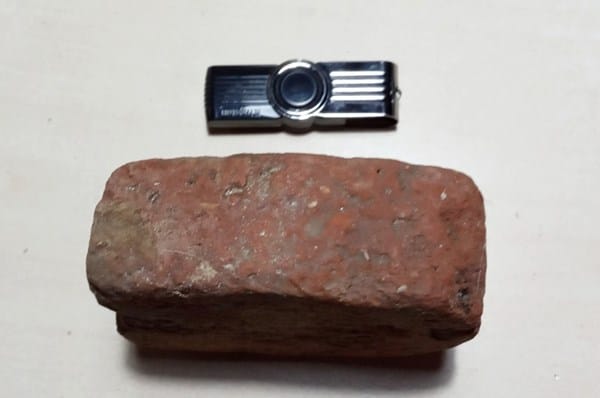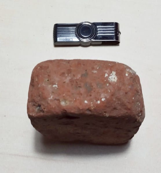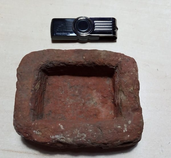Arcilla roja, rectangular, 8,5 x 6,5 x 3 centimetros. Con un hueco rectangular en el centro, peso 240 gramos.