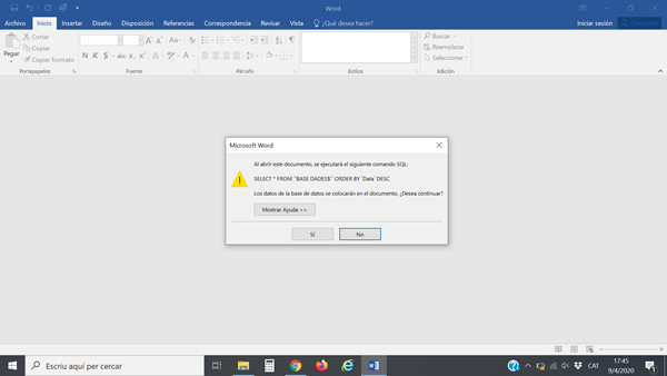 Una vez hecha una combinación de correspondencia en word/excel, cada vez que se abre la carta en word sale un mensaje. ¿Se puede evitar que salga el mensaje y salga directamente la carta combinada? La respuesta a la pregunta siempre es aceptar por tanto evitarla.