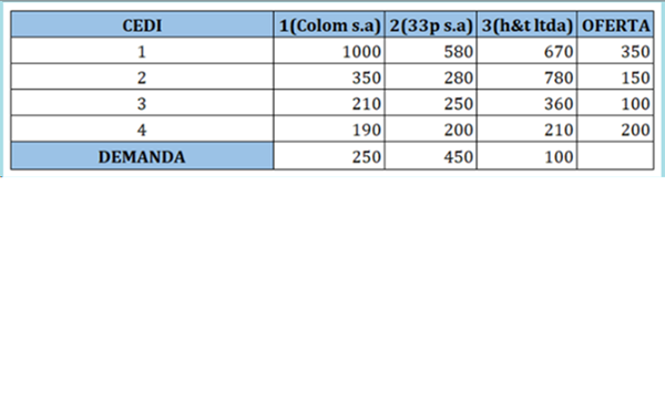 La empresa chocolates del occidente s.a., te ha contratado como Director de logística de la compañía. Al revisar la programación de despachos de la siguiente semana, encuentras que la compañía debe distribuir 800 toneladas de su producto tipo A, a 3 de sus principales clientes en Bucaramanga. Como Director de logística debes realizar una distribución la cual genere el mínimo costo para maximizar la utilidad.