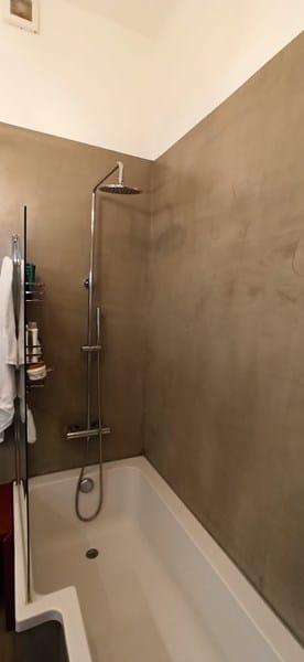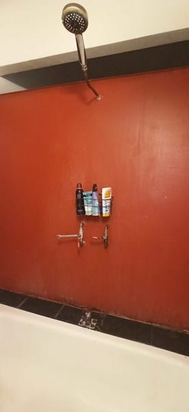 La ducha está rodeada por una pared de pladur que fue puesta hace unos 10 años. Tiene dos llaves de agua comunes y una alcachofa que sale por encima unida por una tubería de cobre.
