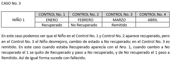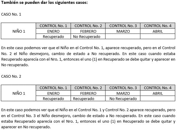 Cada niño que es atendido en cada uno de sus controles de desnutrición puede presentar cualquiera de las anteriores opciones. En el formato de seguimiento solicitan lo siguiente: