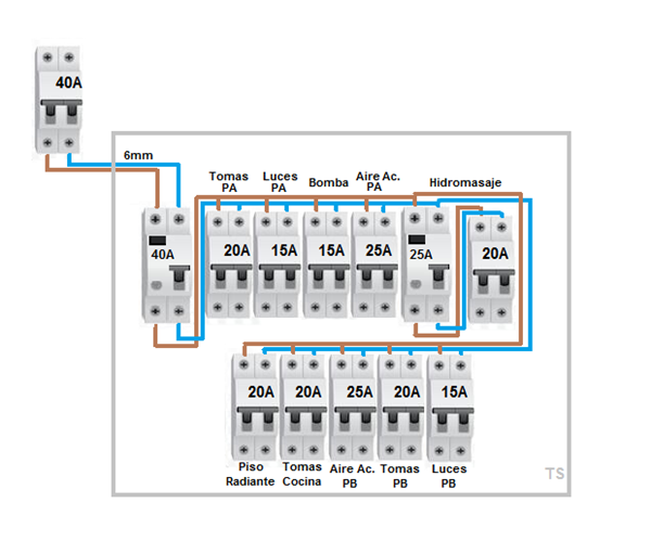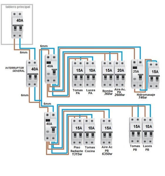 Primero quiero mostrarte cómo se encuentra actualmente mi distribución, sé que esta mal y aunque la instalación funcione así me veo en la obligación de solucionarlo. Las iluminarias llevan cable de 1.5mm, las tomas 2.5mm y los aires acondicionados 4mm: