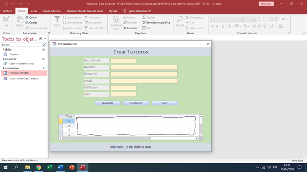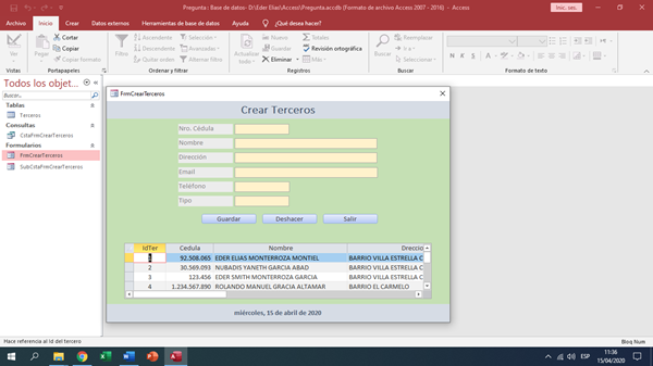 Señores muy buenos días, Dios los bendiga. Tengo una tabla llamada Terceros formada por los campos IdTer (Autonumérico), Cédula (Texto), Nombre (Texto), Dirección (Texto), Teléfono (Texto), Email (Texto), Tipo (Numérico). Etc. Tengo un formulario principal llamado FrmCrearTerceros, en este formulario es donde creo un subformulario llamado SubCstaFrmCrearterceros, el cual proviene de la consulta llamada CstaFrmCrearterceros, la consulta la hago de la tabla Terceros, En el formulario principal en el evento al cargar tengo este código: