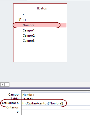 UPDATE TuTabla SET TuTabla.Campo= fncQuitarAcentos([Campo]);