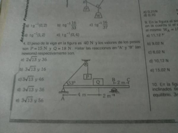 El peso de la viga es 40 N y los valores de los pesos son P=15N y Q=18N. Hallar las reacciones de A y B (en newtons) respectivamente son: