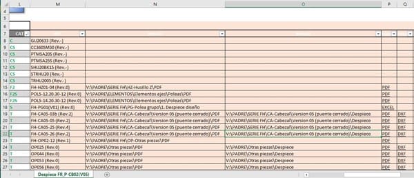 Tengo una carpeta padre con muchas subcarpetas y dentro, otras tantas, y así muchos niveles. Tenemos unas carpetas llamadas "1. Despiece diseño" distribuidas dentro y mezcladas con el resto en distintos niveles dependiendo de los casos. Dentro tenemos unos Excel que listan una serie de referencias. Algunas de estas se asocian a unos archivos con distintas extensiones con el mismo nombre que la referencia (sin extensión). No existen archivos duplicados. Pueden haber archivos con el mismo nombre pero con distinta extensión. Cada referencia puede llevar asociado un pdf, un pdf y dxf, un excel o ninguno. Eso lo indica la columna J mediante un código de letras. Y las rutas debe devolverlas en la columnas distintas según la extensión. En mi caso en la columna N (pdf o excel) y O (dxf).