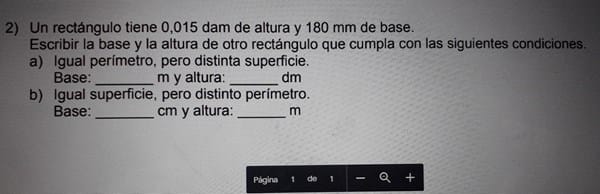 Un rectángulo tiene 0,015 dam de altura y 180 mm de base.Escribir la base y la altura de otro rectángulo que cumpla con