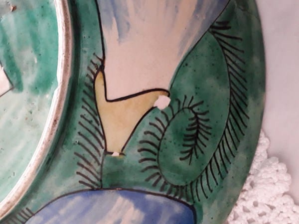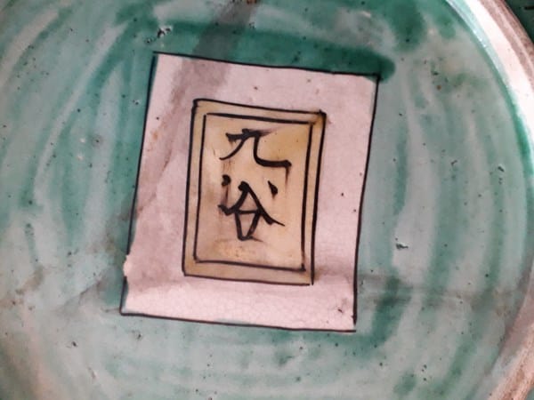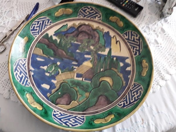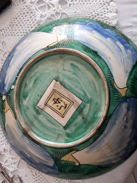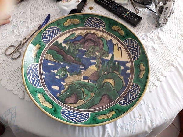 La pieza sobre la que pido información es de cerámica color blanca con grueso vidriado decorado con paisajes chinescos. Mide unos 40cm de diámetro y unos 8 cm de profundidad. Sé que existen muchas piezas de principios de siglo xx de Manises que imitaban porcelanas asiáticas o incluso versiones inglesas tipo "puente y paloma" como ésta, pero la firma con caracteres "chinos" de la parte de atrás me sorprende.