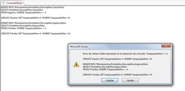 Tengo tres tablas: TGastos.- Registros= IdGastos, FechaMov, DescripMov, GastosMov; TVentas .- Registros= idVentas FechaMov-DescripMov e IngresosMov; y TMovimientos.-Registros= IdMovimientos, FechaMov; DescripMov, IngresosMov y GastosMov. La tabla TMovimientos debe de estar recibiendo información continuamente de las otras dos sin que se dupliquen los datos. Lo he intentado con "Anexar" y con "Unión" y no soluciona el problema. Lo he intentado sin éxito con la siguiente consulta :