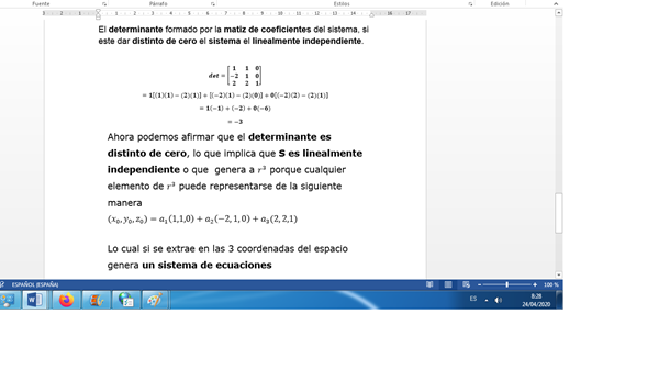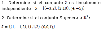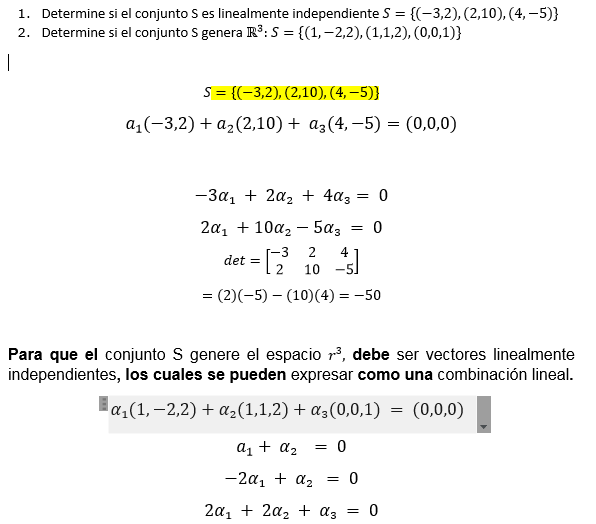 $$\begin{align}&S={(-3,2),(2,10),(4,-5)}\\&a_1 (-3,2)+a_2 (2,10)+ a_3 (4,-5)=(0,0,0)\\&\\&-3α₁ + 2α₂ + 4α₃= 0\\&2α₁ +10α₂-5α₃ = 0\\&det=[■(-3&2&4@2&10&-5)]\\&=(2)(-5)-(10)(4)=-50\\&\\&Para que el conjunto S genere el espacio r³, debe ser vectores linealmente independientes, los cuales se pueden expresar como una combinación lineal.\\&α₁(1,-2,2)+α₂(1,1,2)+α₃(0,0,1) = (0,0,0) \\&a_1+ α₂ = 0\\&-2α₁ + α₂ = 0\\&2α₁ + 2α₂ + α₃ = 0\\&\\&El determinante formado por la matiz de coeficientes del sistema, si este dar distinto de cero el sistema el linealmente independiente.\\&\\&det=[■(1&1&0@-2&1&0@2&2&1)]\\&=1[(1)(1)-(2)(1)]+[(-2)(1)-(2)(0)]+0[(-2)(2)-(2)(1)]\\&=1(-1)+(-2)+0(-6)\\&=-3\\&Ahora podemos afirmar que el determinante es distinto de cero, lo que implica que S es linealmente independiente o que genera a r^3 porque cualquier elemento de r^3 puede representarse de la siguiente manera \\&〖(x〗_0,y_0,z_0)=a_1 (1,1,0)+a_2 (-2,1,0)+a_3 (2,2,1) \\&\\&Lo cual si se extrae en las 3 coordenadas del espacio genera un sistema de ecuaciones \\&\end{align}$$