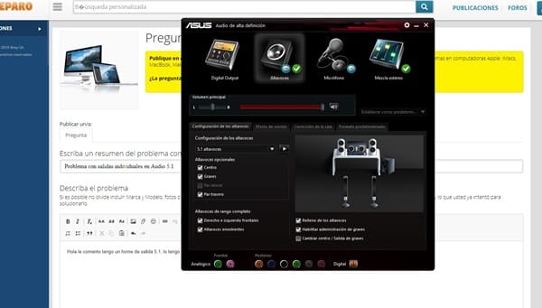 Les paso a detallar mi problema es que cuando hago la prueba de sonido desde la pc al apretar un parlante especifico suenan todos por igual hay alguna forma de cambiar y que suene independientemente? Tengo un home de salida 5.1, lo tengo conectado a la pc salidas RCA del home y entrada mini plug a la pc, mi mother soporta a 7.1 tengo los últimos driver recomendados de la página para mi placa Asus Gaming Aura 970,