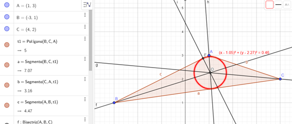 Halla la ecuación de la circunferencia circunscrita al triangulo de vértices a(1,3), b(-3,1) y c(4,2)