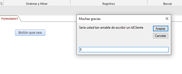Al ejecutar el formulario de ingresos me aparece una ventana emergente para que introduzca el id de la consulta médica "Introduzca el valor del parámetro Formularios!ConsultaMedica!id y funciona correctamente.