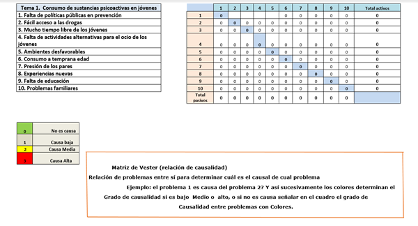 Ayuda con matriz de vester sobre relación de problemas determinando cuales problema son causas del otro y si es bajo, medio o alto el grado de causalidad