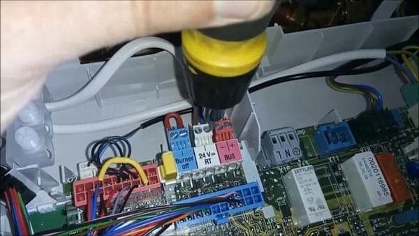 Primero debes abrir la tapa frontal de la caldera donde vas encontrar una placa con varios conectores, tienes que tener un conector blanco donde pone 24V-RT. Si tienes un termostato, este estará conectado aqui. Sino tienes ninguno tendrás que quitar el puente y conectar en su lugar un termostato. Abajo de te adjuntamos la foto de la conexion donde tiene que ir conectado. Tienes que tener la siguiente placa o la otra:
