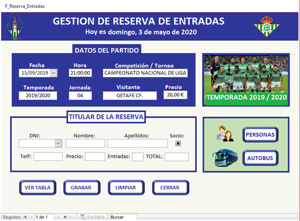 Desde este formulario envío los datos a la tabla "T_Reserva_Entradas" pero al enviarlos, y no se por qué, me pide que introduzca el valor del primer cuadro combinado "fecha" y del campo "Precio". La idea es que se pasen todos los campos sin pedir datos ni hacer preguntas, se limpien los datos de la persona, y se mantengan los datos del partido hasta que sean cambiados por el usuario. Lo primero lo he solucionado en el mismo momento de grabar el registro, pero si cierro el formulario y lo vuelvo abrir, no se mantienen los datos del partido.