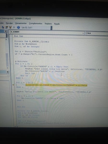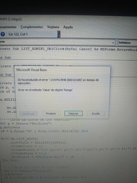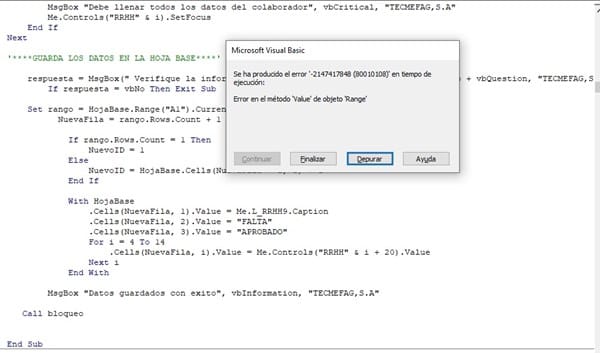Este error ahora me sale en todos los botones donde tengo un ciclo for el cual uso para guardar las capturas en una hoja excel IMPORTANTE: LUEGO QUE SALE ESTE ERROR ENSEGUIDA SE REINICIA EL APLICATIVO DE EXCEL.