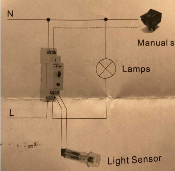 He sustituido un temporizador de instalación DIN marca Graslin Talento 211 por un sensor crepuscular DIN que lleva una célula que se conecta por un cable. El temporizador tiene dos entradas (L, N) para alimentarse y una salida que conmuta la lámpara que quiero controlar. La instalación que tenía compartía la fase (L) (o eso creo) y conmutaba el neutro (ver dibujo), por lo que en el cuadro tengo acceso a L, N y un sólo cable que va a la lámpara que me imagino será N.
