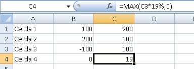Celda 4: 19% de resultado de celda 3 (19%de -100), en este caso sería: -19 (yo quiero que si el resultado es negativo 0 igual a 0, que el resultado final sea: 0.