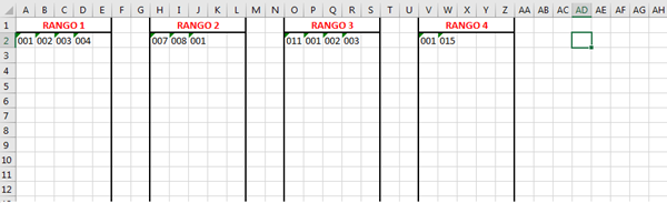 Necesito básicamente que la macro lea los datos que están en esos 4 rangos y los números que NO están repetidos los pegue a partir de la columna AD, en este caso serian los números "004" "007" "008" "011" "015", resalto que los rangos en la macro deben ir por separados, y poderlos después reemplazar, osea (rango 1 "A:E") ( rango 2 "H:L") (rango 3 "O:S") rango4 "(V:Z") informo que los datos de la tabla están en formato texto y como ven hay algunas celdas vacías también. No siempre están los rangos totalmente llenos de datos y seria que se ejecute en la fila donde estoy activo.