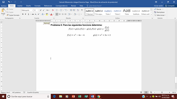Problema 6: Para las siguientes funcione determina: f(x)+g(x),f(x)-g(x),f(x)∙g(x) y f(x)/g(x) f(x)=x^2-4x-4