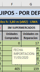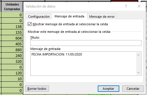2 - me muestre la fecha de importación, dato que debo leer de la Hoja("STOCK") ==> este dato de fecha de importación inevitablemente podre obtenerlo con BUSCARV, es decir, cuando paso con el cursor sobre la celda F7 de la hoja("INFORME"), debo utilizar el dato que está en celda B7 de esta misma hoja y mediante BUSCARV(B7;STOCK(A2:O2000);15;FALSO), tendré la famosa fecha que debo mostrar en el mensaje al pasar el cursor.