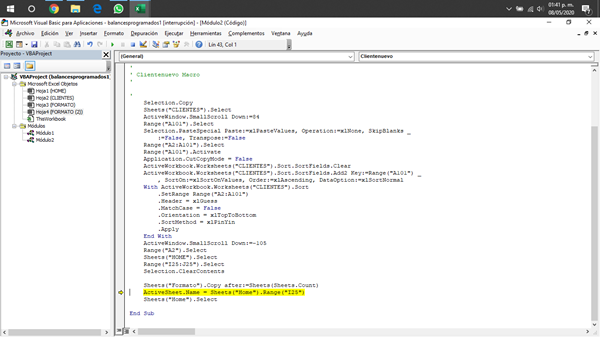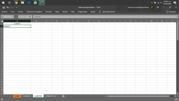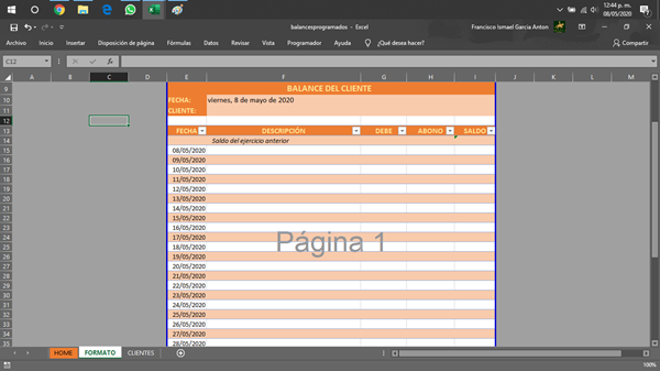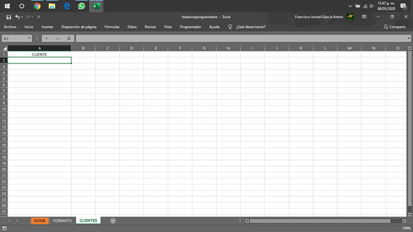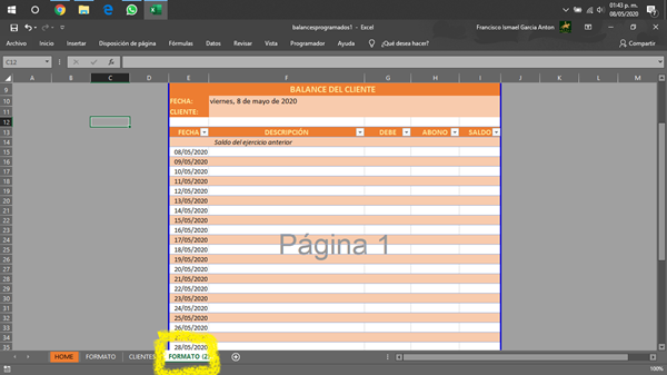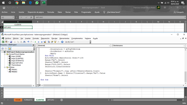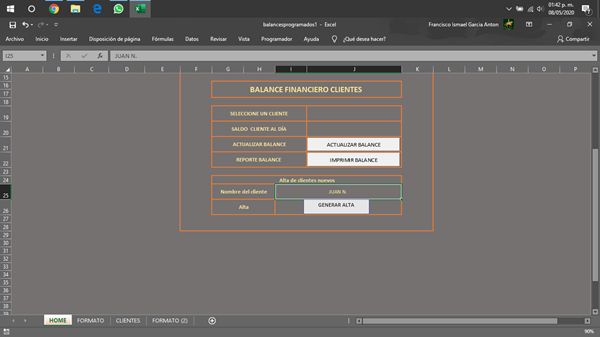 En "home" esta una celda donde ingreso el nombre, luego le doy guardar cliente y se copia el nombre a la hoja "clientes". Y de ahi pretendo que con esa alta automáticamente se cree la hoja de estado de cuenta para ese cliente, considerando que ese estado de cuenta sale de la hoja "formato" vacía para que se replique con cada cliente que añada.