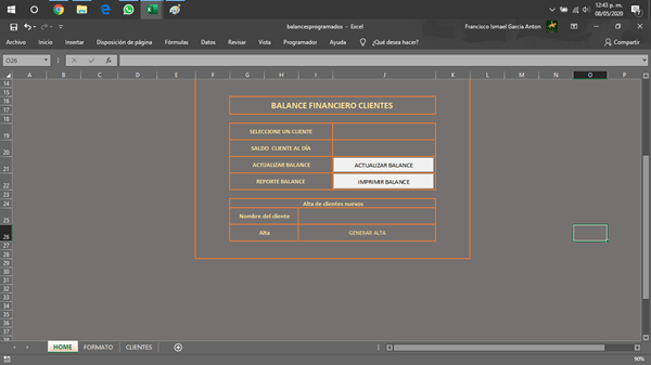 En "home" tengo un apartado de "dar de alta nuevo cliente". Y mi pregunta es, ¿cómo hago una macro que me permita que "formato" se replique una y otra vez por cada cliente nuevo dado de alta? Y que, además la hoja generada tenga el nombre del cliente ingresado puesto que en "home" tengo un botón que me permite imprimir el estado de cuenta del cliente a partir de la lista desplegable que mencionaba al inicio. He conseguido hasta ahora solo que la hoja de formato se replique pero no nombrarla con el nombre del cliente.