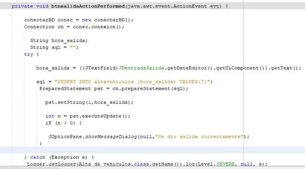 Aquí tengo mi código del evento de acción de botón salida con conexión a la base de dato.