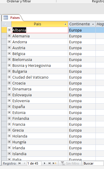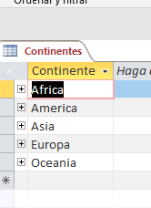 Como los continentes no se van a repetir, he puesto el campo como clave. Luego tengo la tabla Paises, relacionada con la anterior por continente(sería exactamente igual que si usaras un Id)