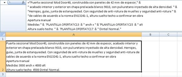 Tengo unos texto predefinidos de una descripción, en este caso es la descripción de una puerta. En la celda hay un texto muy largo que define todas las características de la puerta, en uno de los párrafos se indica : De medidas .3000 ancho por 3200 alto, pero estos datos los cambiamos según la solicitud, los datos de la medida cambian en otra pestaña de la hoja excel para el calcular el precio. Pero se me olvida cambiar la siguiente medida y siempre sale con la misma. Porque debo hacerlo de forma manual, ¿se puede combinar de alguna forma y que aparezca estas medidas en el texto predefinido?