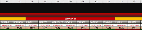 Pues bien, intento lograr una fórmula que busque a lo largo de toda la fila 5 la coincidencia en dato con la fecha actual (x ej: celda SJ5 ==> 16/05/2020) y una vez que esto sucede, coloque una fórmula (cualquiera, ya que no vendría al caso) en la celda inmediata inferior (celda SJ6)