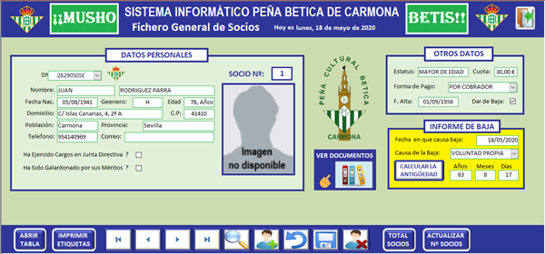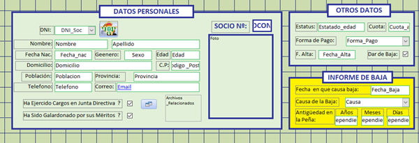 Por cierto, la bd de datos que estoy intentando construir, es para dotar a mi peña, que es la segunda mas antigua de España, de una herramienta que facilite, a nivel de usuario, la llevanza administrativa del día a dia de la entidad, de la que soy el actual presidente, y que se encuentra muy atrasada en el uso de estas tecnologías. Ni que decir tiene que se trata de un proyecto altruista al que dedico todo el tiempo que mi condición de jubilado me permite.