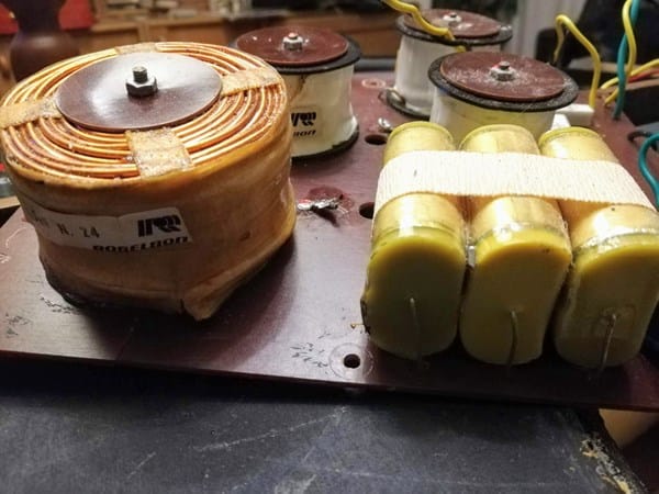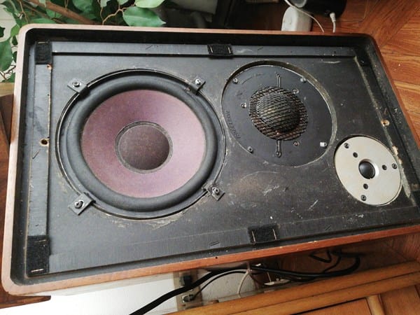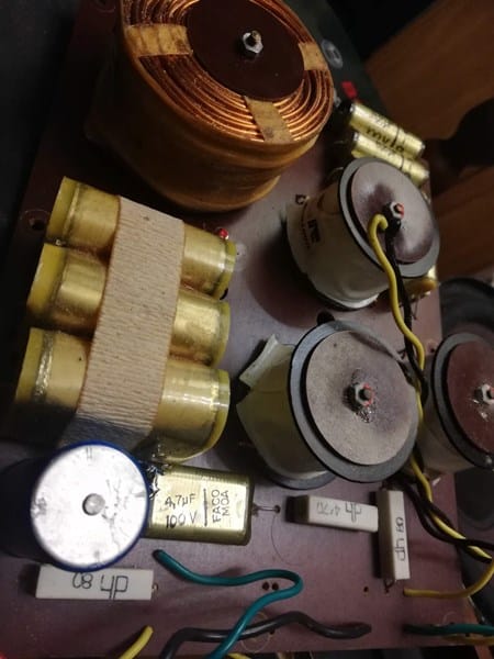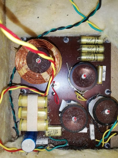 Normalmente uso un amplificador Sansui AU-101 del año 1974 con unas cajas de 3 vías Roselson de la misma época. Ante el problema decidí utilizar otro amplificador del que también dispongo y tenía un poco aparcado un Luxman L-215 del año 1986 y el problema persiste. Probé a llevar el Sansui a casa de un amigo vecino y en su casa con unas JBL Control 28 (no son HIFI, son Pro) suena estupendamente. Me armo de valor y después de poner la oreja en cada una de las vías quito el woffer para echar un vistazo al filtro y cableado. En principio todo parece estar en orden, no se ve ningún condensador hinchado ni óxido, todas las conexiones parecen estar bien, hay una pareja de cables de color amarillo y negro que no van a ningún sitio y que imagino que estarán destinados a una cuarta vía.(Adjunto fotos)