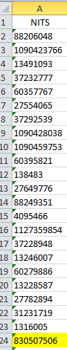 La presente es para saber si se puede crear una macro que sea capaz de adicionar caracteres específicos a una o varias celdas. Como pueden observar en la imagen tengo una columna que tiene diferentes números, estos pueden ir de la A2 hasta la A5000. Necesito una macro que sea capaz de adicionar una - y el número 1 a toda celda que este de color amarillo; como en el caso de la celda A24 de la presente tabla. El numero quedaría así: 830507506-1. De antemano muchas gracias