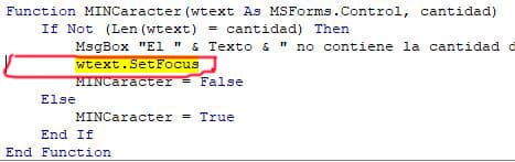 Function MINCaracter(wtext As MSForms.Control, cantidad) If Not (Len(wtext) = cantidad) Then MsgBox "El " & Texto & " no contiene la cantidad de dígitos necesarios", 64, "" wtext.SetFocus MINCaracter = False Else MINCaracter = True End If End Function