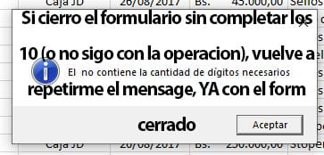 Luego aqui está el detalle, al no seguir con la operacion y cerrar el form, me vuelve a repetir el mensaje