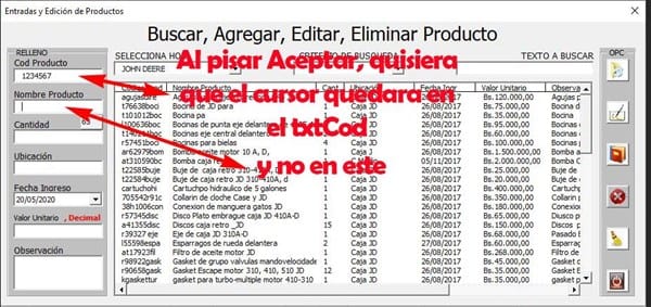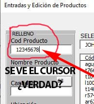 En el aviso, piso aceptar, desaparece el aviso y el cursor aparece en otr oTectBox NO EN EL txtCod donde debo completar la cantidad de caracteres (10) para que pueda seguir llenando los demás textBox.