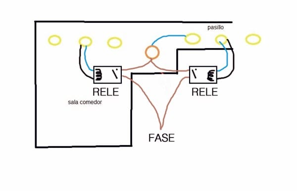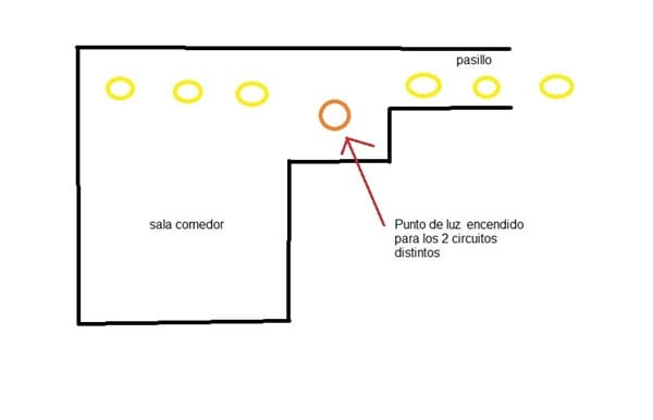Quisiera poder encender un punto de luz desde dos ciscuitos distintos, NO UN CONMUTADO, me explico, en la vivienda esta el circuito de pasillo, luego una pequeña entrada y luego el comedor, lo que quisiera es el punto de luz que esta en esa entrada poder encenderlo desde cualquiera de los dos circuitos indistintamente, sea pasillo o sea comedor . Adjunto un peq esquema para intentar aclararlo .