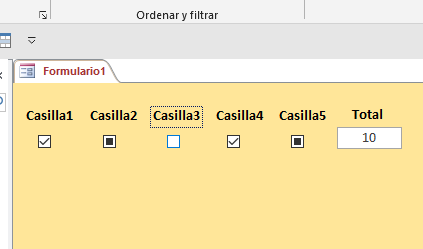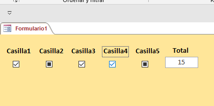 Tengo un formulario con seis casillas de verificación y un cuadro de texto. Necesito que en el cuadro de texto se vayan sumando valores en función del valor de cada casilla. Por ejemplo: si el valor de la casilla 1 =true, entonces el valor de cuadro de texto = 5, si el valor de la casilla 2=true, entonces el valor del cuadro de texto seria =5+5... Y así con todas las casillas, pero si el valor de alguna casilla cambia a false, entonces se debe restar su valor del cuadro de texto.
