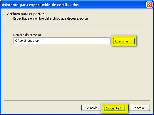 Deja la opción por defecto que viene marcada que suele ser “DER binario codificado X.509 (. CER)” y haz clic en “Siguiente. A continuación, elige dónde guardar el certificado y ponle un nombre al certificado.