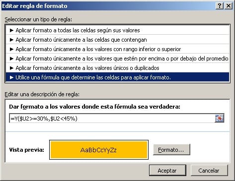 Quisiera me puedas orientar en cuanto a la posibilidad de colorear todo un rango fila desde (Ai:Yi) según el valor que se encuentre en la celda Ui (en ésta hay una fórmula) y replicar el formato hasta la última fila con datos, de manera que: