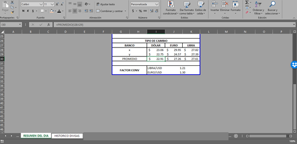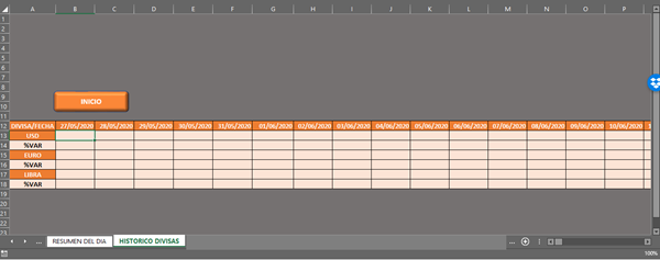 Tengo un libro de excel con una hoja llamada "resumen del día", donde consigno valores de tipo de cambio: dólar, euro y libra para el día en curso, como esos valores no son los mismos a diario, busco la manera de pegarlos en otra hoja llamada "histórico de divisas" para el día que le toca, luego que en "resumen " se borren los anteriores, para que cuando llegue a la mañana siguiente a ingresar los nuevos valores, estos igualmente se copien en "histórico", y así sucesivamente.