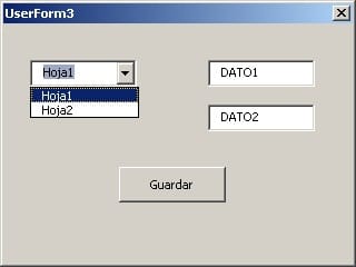 Private Sub CommandButton1_Click() Dim lr As Long If ComboBox1.Value = "" Or ComboBox1.ListIndex = -1 Then MsgBox "Selecciona la hoja" ComboBox1.SetFocus Exit Sub End If If TextBox1.Value = "" Then MsgBox "Captura Dato1" TextBox1.SetFocus Exit Sub End If ' With Sheets(ComboBox1.Value) lr = .Range("A" & Rows.Count).End(3)(2).Row .Range("A" & lr).Value = TextBox1.Value .Range("B" & lr).Value = TextBox2.Value End With End Sub ' Private Sub UserForm_Activate() ComboBox1. AddItem "Hoja1" ComboBox1. AddItem "Hoja2" End Sub