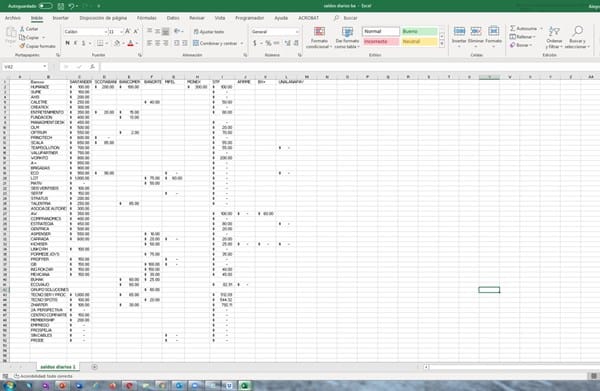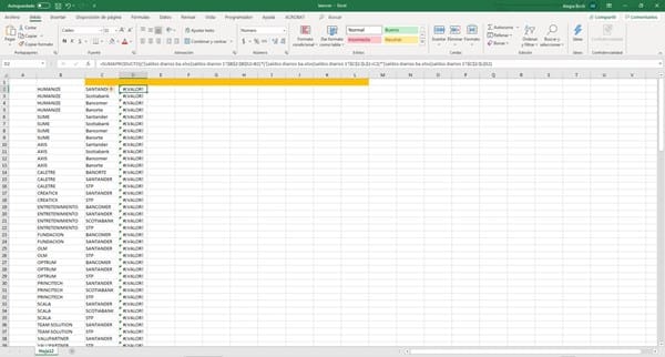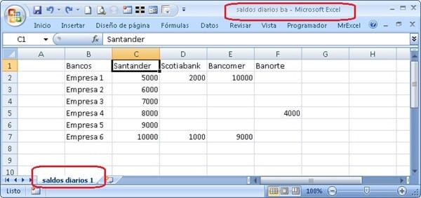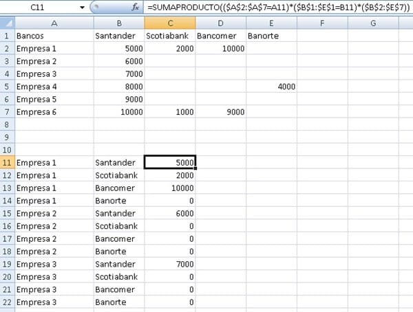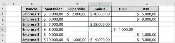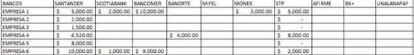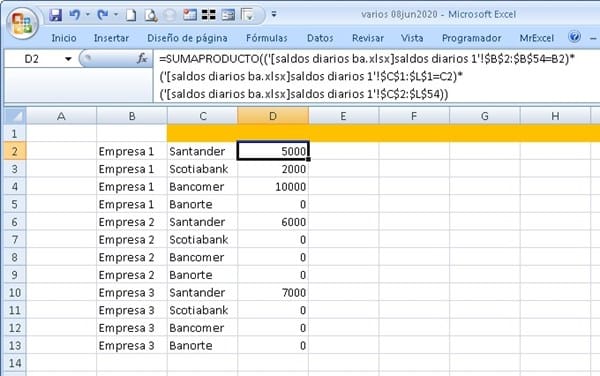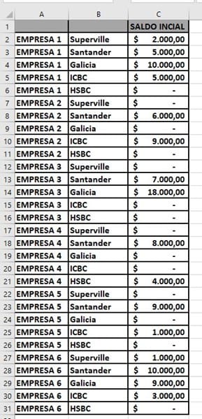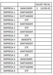En la columna donde dice saldo inicial en la 2nda tabla necesito que me devuelva el saldo dependiendo de la empresa y el banco al que pertenece.