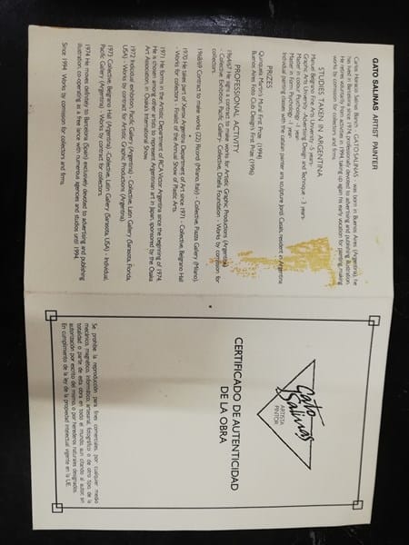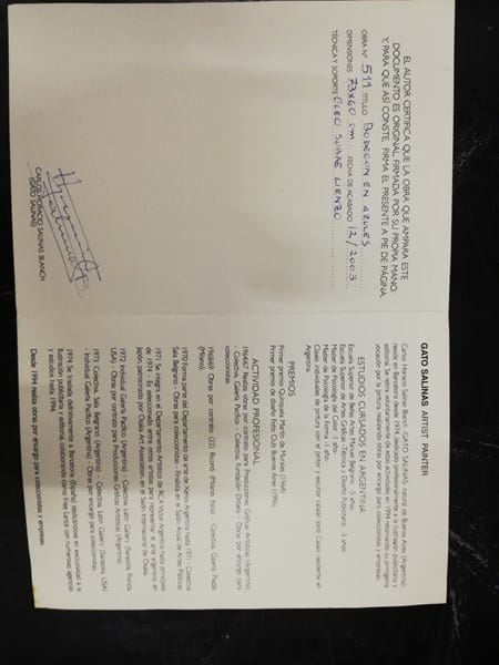 Tengo un oleo de medidas 73x60 con certificado de autenticidad firmado gato salinas con un anagrama al lado de la firma, se titula bodegón en azules, en el certificado explica un poco la carrera de este pintor pero no encuentro nada sobre el valor de sus obras,¿necesitaría si alguien me puede ayudar o donde podría informarme del precio?