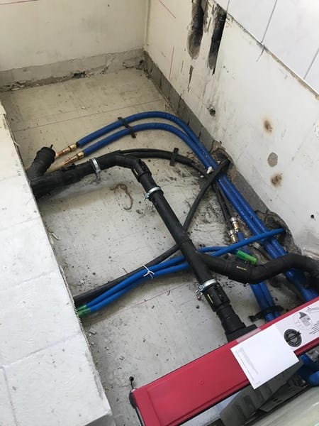 Si veis la foto, hay unos cables azules con protector de plástico (los que están más pegados a la parte roja y cruzan todo el plato) que van desde la cocina y pasan por debajo de el plato de ducha que van a instalar. Estos continúan por debajo del water hasta otro baño contiguo. La pregunta es cuanto seguro es aunque el electricista dice que es legal e impermeable. Gracias