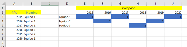 3.- Colocar el numero 1 en cada una de las filas (E - J) a los equipos campeones por año