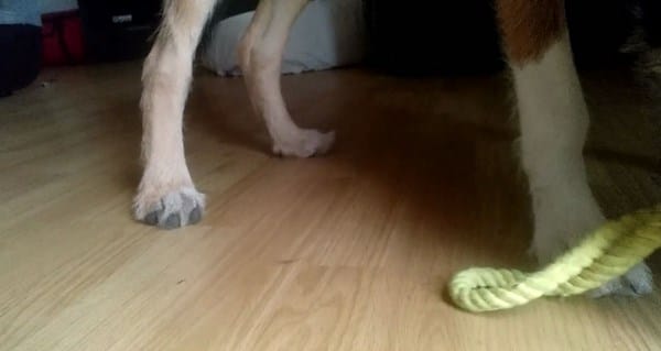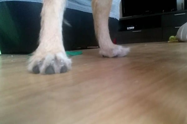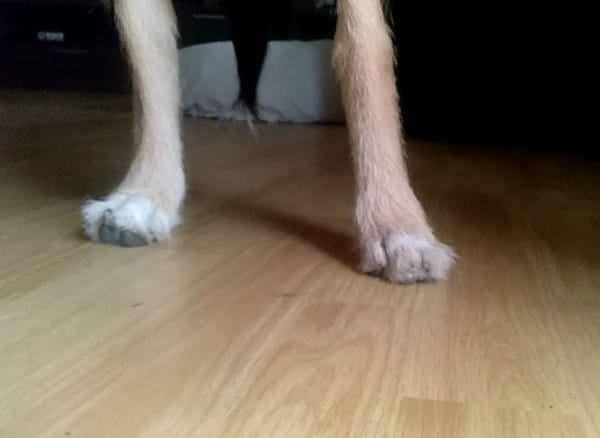 Mi cachorra de cinco meses tiene una postura extraña que no he visto en mis otros perros. De pie se le ven perfectamente las almohadillas de los dedos de las patas traseras. Adjunto fotografías porque no sé si debería ir al veterinario, si es un problema de carpos que requiera algún tipo de férula o incluso operación, o si es un aplomo peculiar que no tiene mayor importancia. Muchísimas gracias.