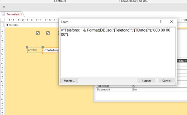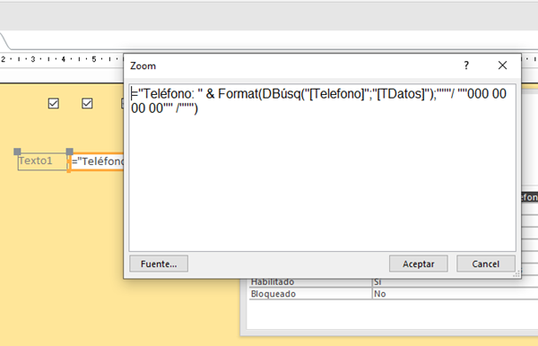 ="Teléfono: " & Format(DBúsq("[Telefono]";"[TDatos]");"\'000 00 00 00\'")Pero el resultado me queda siempre '000 00 00 00', con los dos apóstrofos. Si los quito, me aparece un cero delante.